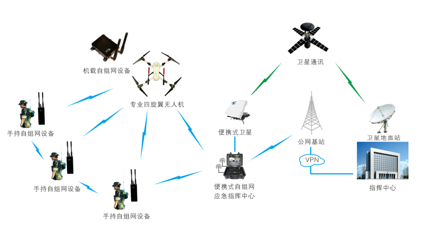 综合运用“卫星专网+公网+Mesh自组网”构建的可快速开设现场指挥通信解决方案。系统聚焦于应急现场“最后一公里”的通信、空地通联、可视化指挥调度三部分,将“全力保障应急通信的畅通”作为第一要务,借鉴军队联合作战指挥系统的建设思路,方案以高效、协同、精准、 精简为核心理念,采用服务云化、一张图指挥、卫星通信、Mesh自组网等技术,后方依托应急云构建应急指挥平台, 一线以“卫星专网+公网+Mesh自组网”构建现场通信网络,提供现场视频回传、视频通话、语音通话、视频分享、 电子地图、多方视频会商等能力,实现分钟级开设,可灵活组合,极大提高应急通信保障效率。